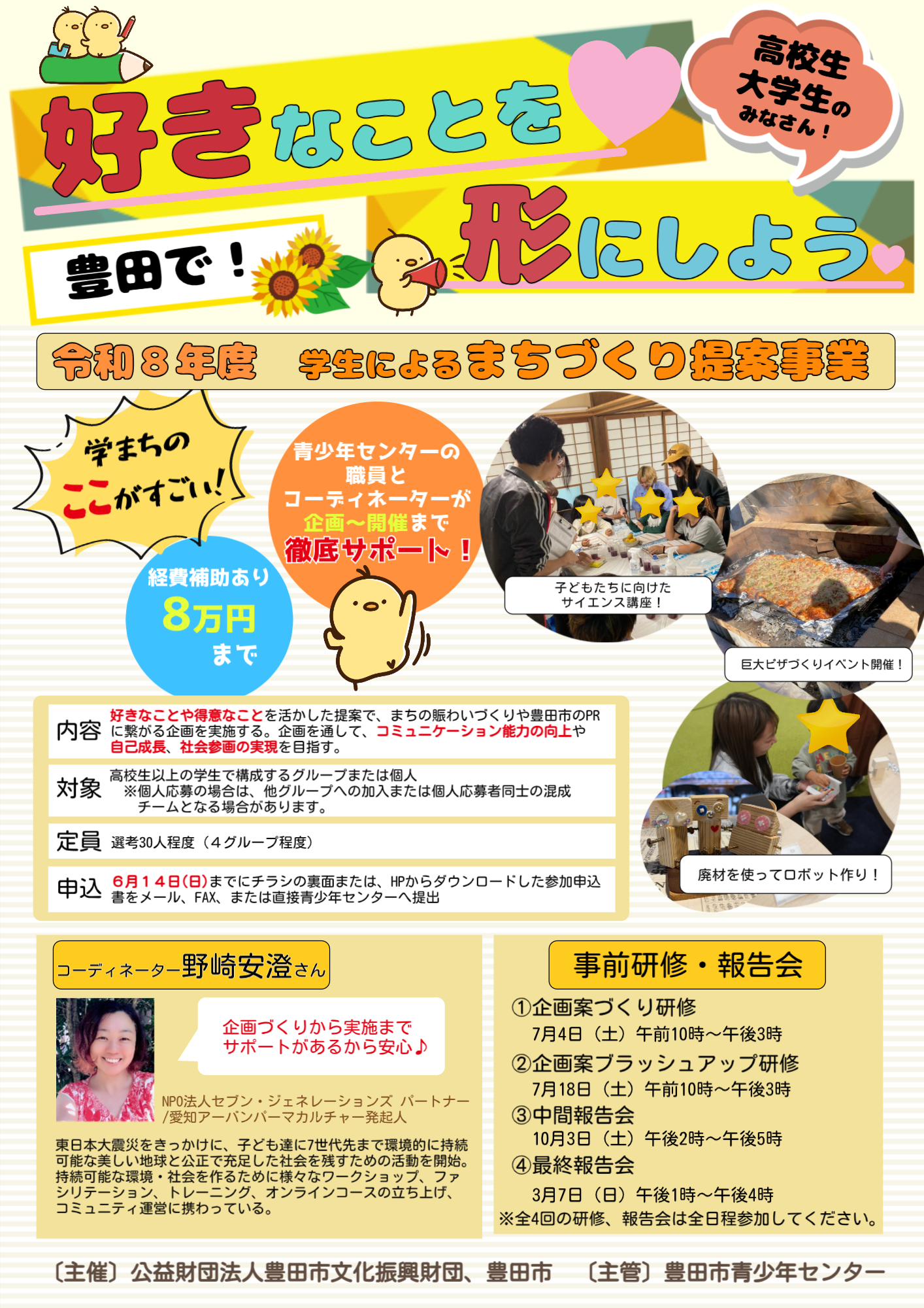 体験,参加する,若者,趣味★学生によるまちづくり提案事業とは…?この事業は学生の「好き」「得意」と「まちづくり」をつなげ、学生の思いを形にすることを主に、資金面と企画面で応援する事業です。 活動資金は8万円まで支援があります。企画段階 […]