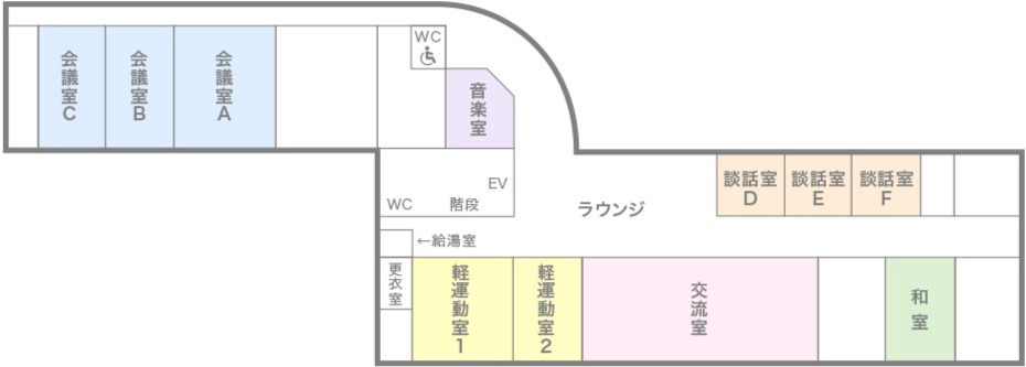 (17:00-21:30)面積 交流室 150人 4,400円 4,400円 4,400円 170㎡ 会議室A 60人 2,200円 2,200円 2,200円 85㎡ 会議室B 40人 1,600円 1,600円 1,600円 57㎡ 会議室C 40人 1,600円 1,600円 1,600円 57㎡ 談話室D 12人 600円 600円 600円 27㎡ 談話室E 12人 600円 600円 600円 28㎡ 談話室F 12人 600円 600円 600円 28㎡ 軽運動室1 25人 2,000円 2,000円 2,000円 71㎡ 軽運動室2 15人 1,400円 1,400円 1,400円 46㎡ 和室 24人 1,100円 1,100円 1,100円 53㎡ 音楽室 20人 2,400円 2,400円 2,400円 42㎡ - ※1青少年育成団体、青少年登録サークル等、青少年の団体が利用する場合は使用料は免除となります。